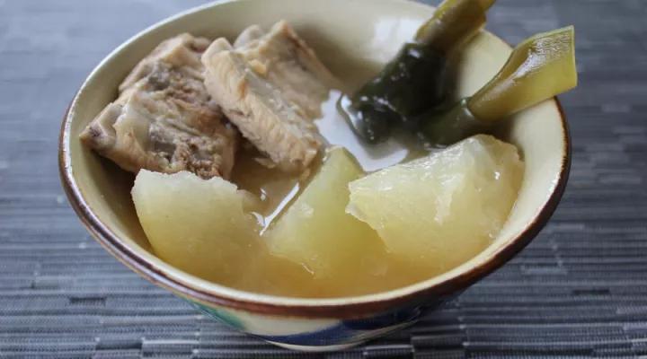 冬瓜海带排骨汤 = 材料配方 = 排骨 500g 冬瓜 适量 海带 60g 姜片 适量 葱花 适量 盐 适量 清水 大量