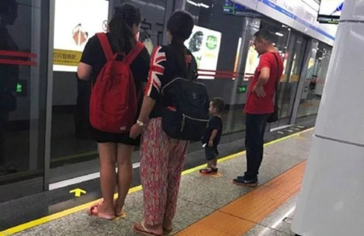 一个2岁左右的孩子问爸爸妈妈: 脚下踩的脚印是干嘛的 孩子的爸爸妈妈特别耐心地给她解释 这是用来引导乘客排队的 并且全家都认真的整齐地排给孩子看