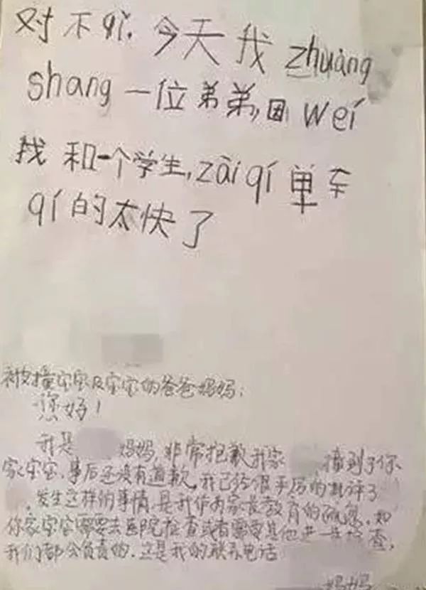深圳一名七岁小学生骑单车撞倒三岁娃娃 因沟通不畅未作处理就各自回家了 当小学生妈妈下班知晓后 让他手写六份夹杂着拼音的道歉书 然后在全小区张贴寻找被撞的孩子 最终成功找到并登门道歉