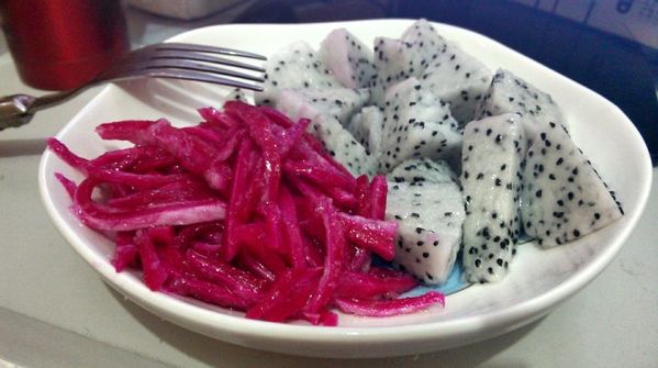 所以,我们在吃火龙果的时候,尽量不要丢弃内层的粉红色果皮。花青素对温度敏感,应生食为佳。可以用小刀刮下直接生吃,或切成细条凉拌,榨汁食用也是不错的选择。