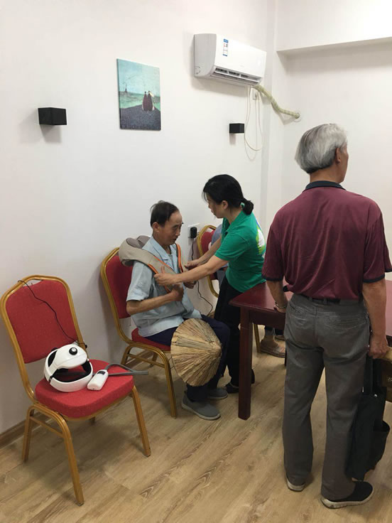 银海•俩宝贝工作人员在免费给社区老人作肩颈按摩