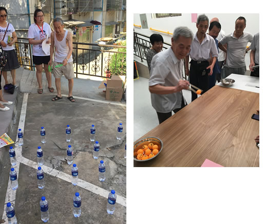 社区组织的有奖套圈正在考验老玩童们手眼协调的本领,筷子夹球游戏前排起了长长的队伍