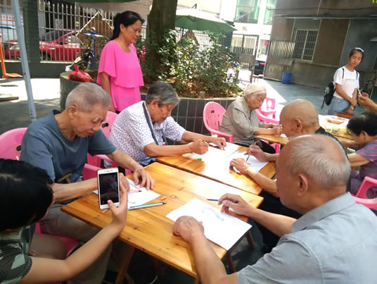 看,龙爷爷在和其他老人一起在玩画图填色的游戏,不亦乐乎! 在中心年龄博物馆龙爷爷和社区老人们正在免费体检等候中……